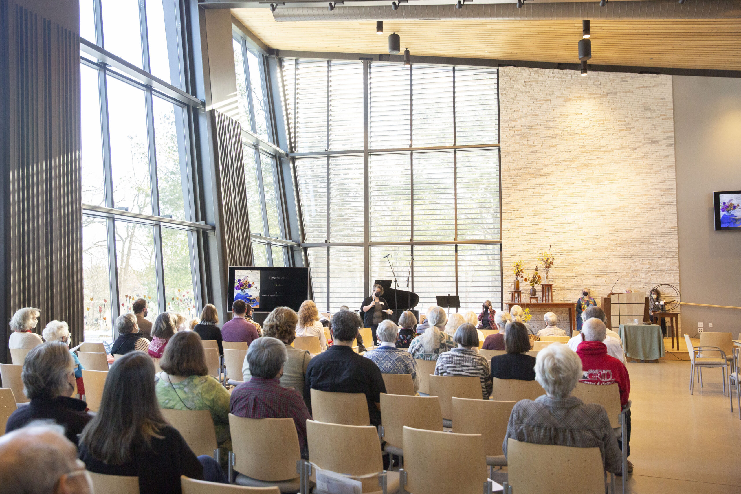 Our 8 acre campus in Coralville allows us to connect spiritually with nature and gather with each other in a sustainably built and maintained building that has been dubbed “the greenest church in Iowa.” Gender neutral bathrooms, flexible indoor seating, integration of indoor and outdoor spaces and multipurpose areas provides an inclusive and welcoming space for people of all backgrounds to enjoy our space. Our outdoor spaces are open to the public and we encourage our interior spaces to be rented for events and group gatherings.