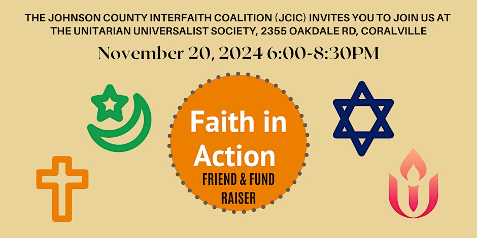 We’re excited to sponsor Johnson County Interfaith Coalition’s annual Faith in Action Friend and Fundraiser on November 20 at UUS! We’d love for you to be a part of this special evening as an attendee, a volunteer, or both.