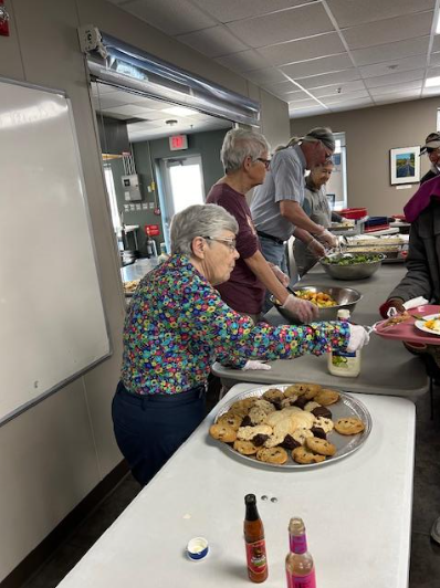 Sharon Booker, Bonnie Penno, and Pete Brokow donated food. 113 diners were served and at least 15 carry-out containers were loaded. There was not one bite of food left! A good time was had by all in the kitchen, and many diners were thankful for the hearty and healthy meal.