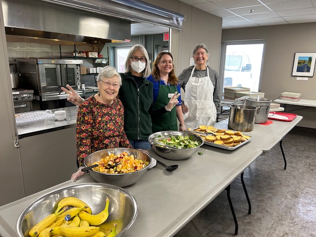 On April 11, the UUS Free Lunch Team made a garbanzo bean bowl with turkey, vegetables, and brown rice, along with a fruit salad and homemade vanilla bars baked by Pete Brokaw. Frank Wildensee came up with the recipe and Bob Littlehale, Juli Statton, Kezia Walker-Cecil, and Barb Haring helped mix up the bean bowls. Russ Lenth and Theresa Ullrich made the fruit salad.