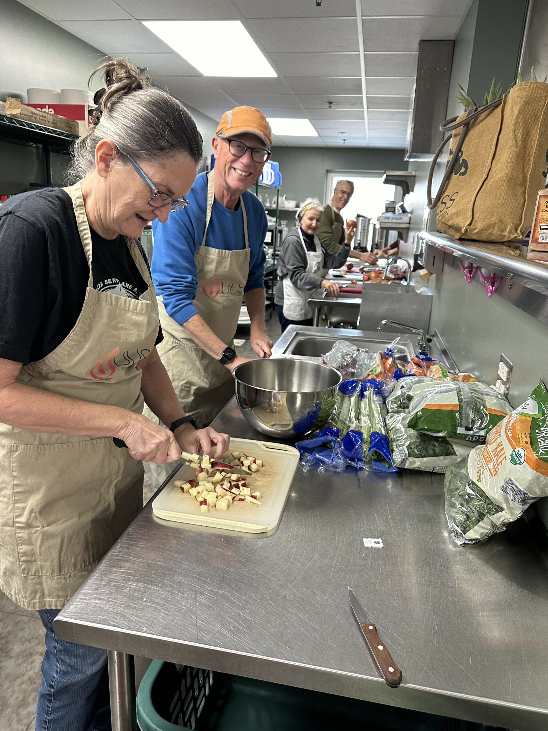 On November 8 a large group of UUS volunteers gathered to make lentil stew- ham and vegan, green salad, fruit salad and serve to 81 diners along with delicious homemade bars. Bonnie and Mark Penno, Sharon Beckman, Ron Pile, Barb Haring, Joy Thompson, David Quegg, Carolyn Johnson, Juliana Statton, Chris Smith, Joe Rasmussen, Carrie Norton, Ron Wright, Cynthia Crawford, Caryl Lyons, Gay Mikelson, John Elson, and Gary Lawrenson joined Frank Wildensee and Vicki Siefers to host the lunch—many thanks to all the people who dropped off fruit, greens and desserts for the lunch also.